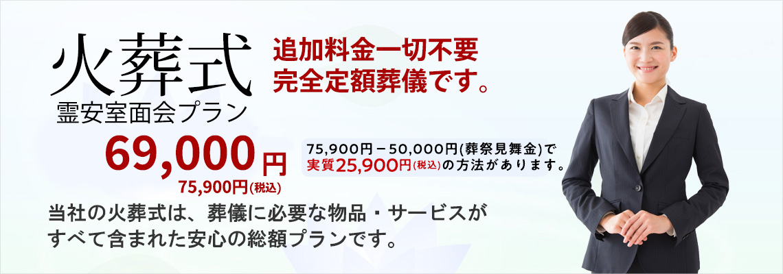 弊社火葬式費用 92,400円(税別)-50,000円(葬祭費)=実質42,400円(税込)となります。